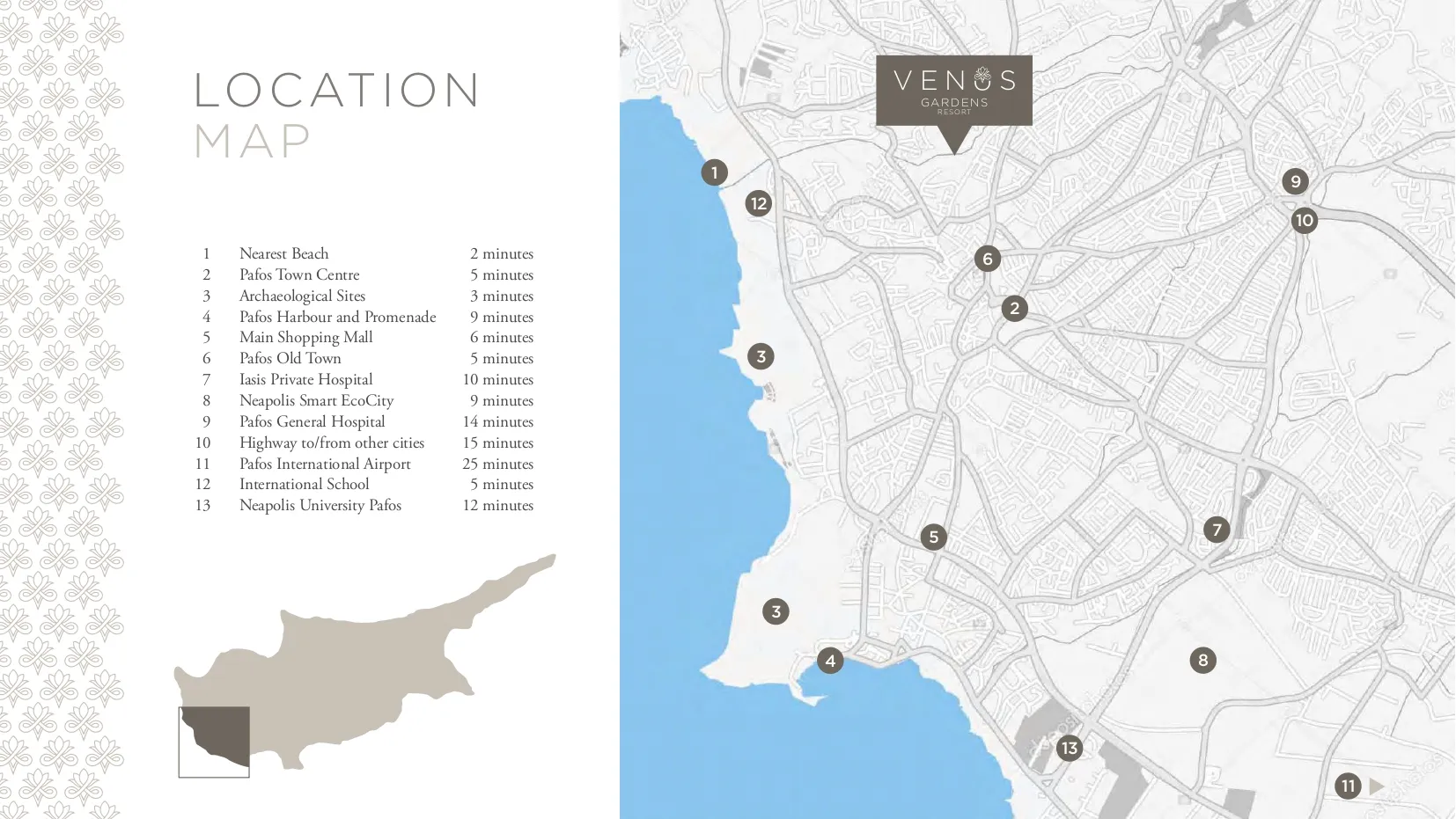 This exclusive hilltop gated development is close to authentic local taverns, bars, pubs and nightclubs and has easy access to all amenities, facilities and services nearby. It is close to an international private school, places of interest and archaeological sites and is a short drive away fro the Paphos Harbour, Promenade, Tourist Area and retail outlets.
